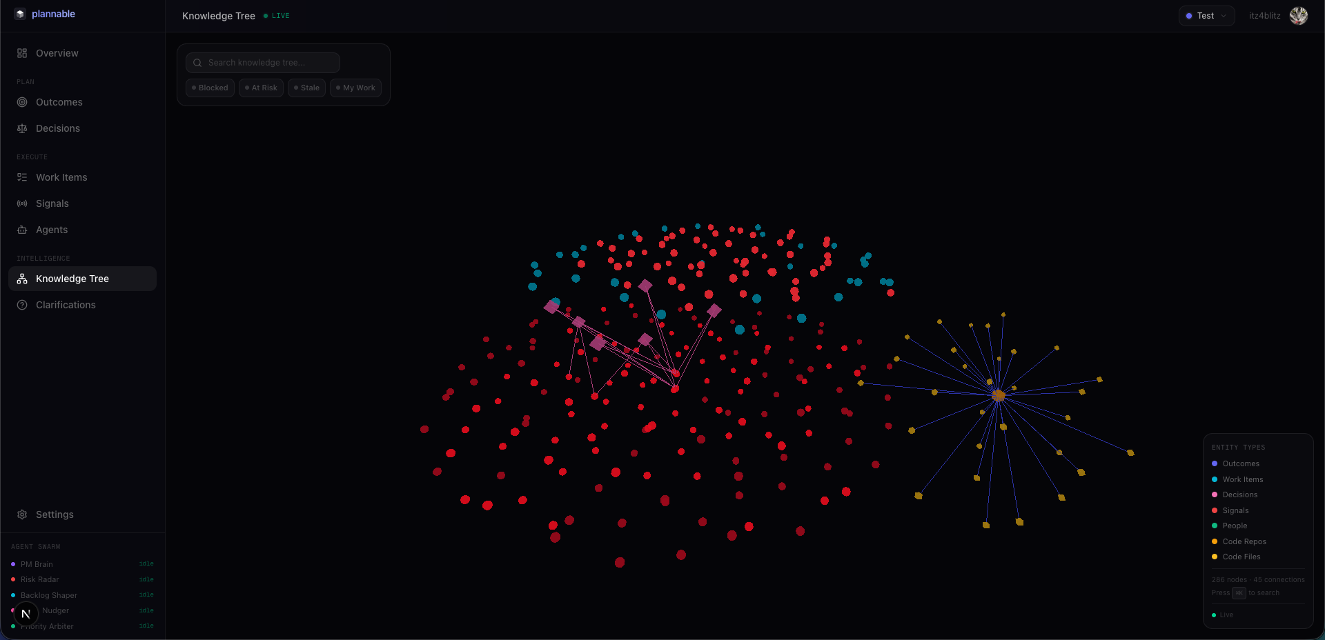 Every piece of information in Plannable is connected in a semantic knowledge tree — not just a flat list of issues and PRs, but an interconnected web of relationships that captures why things matter.