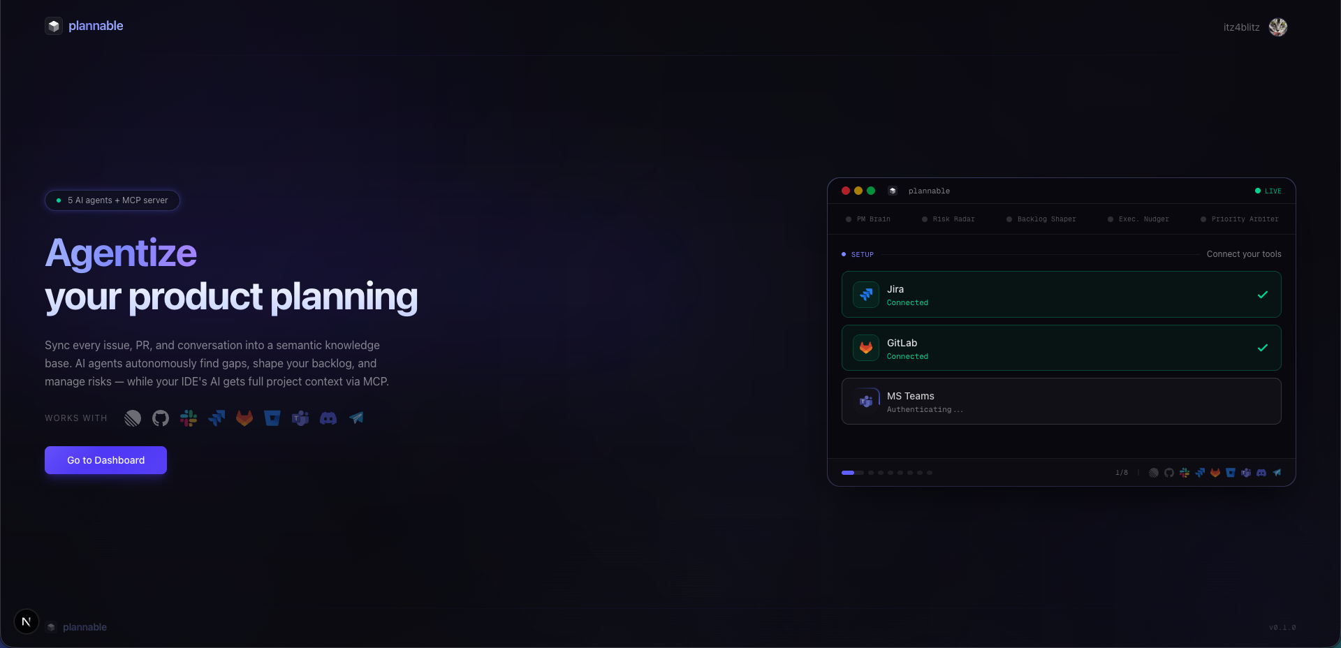 Plannable is an autonomous PM-AI agent — the product manager you wish you had. It never sleeps, never forgets, and is always working to keep your project on track.